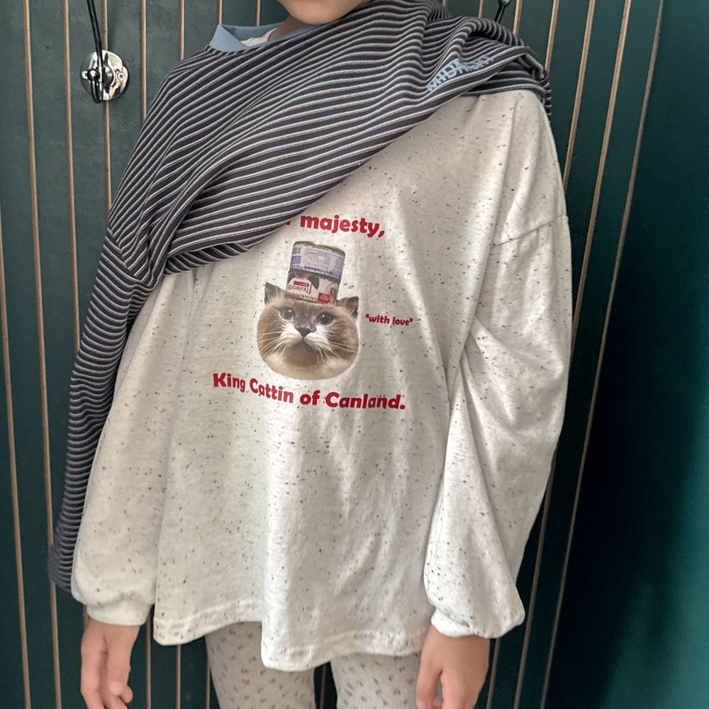 胸元にはインパクトのある猫プリントが施されており、遊び心のあるデザインが魅力です。