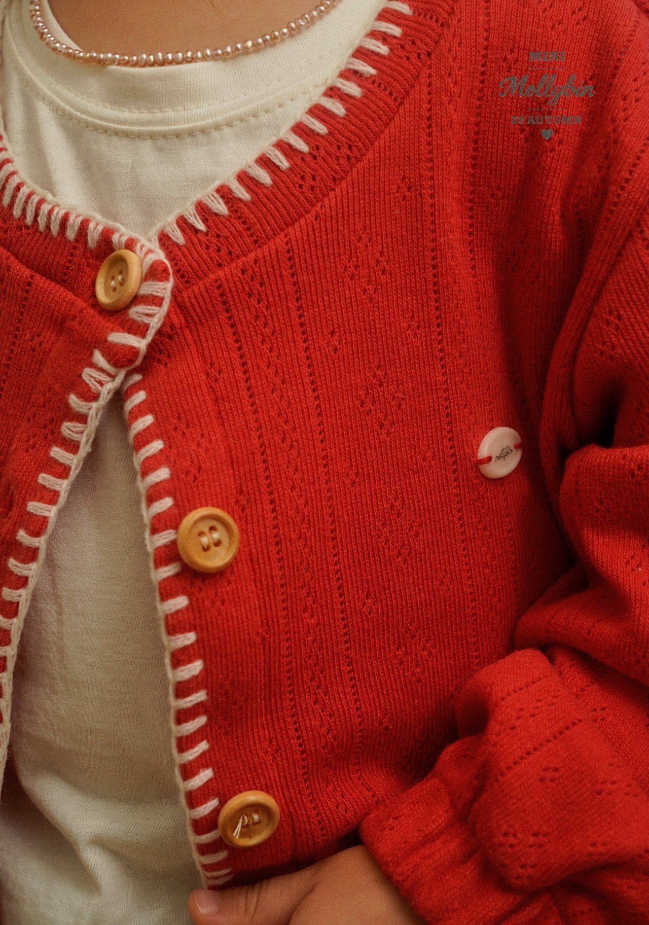 【Mollybin】アイレット刺繍カーディガン レッド 80cm〜110cm