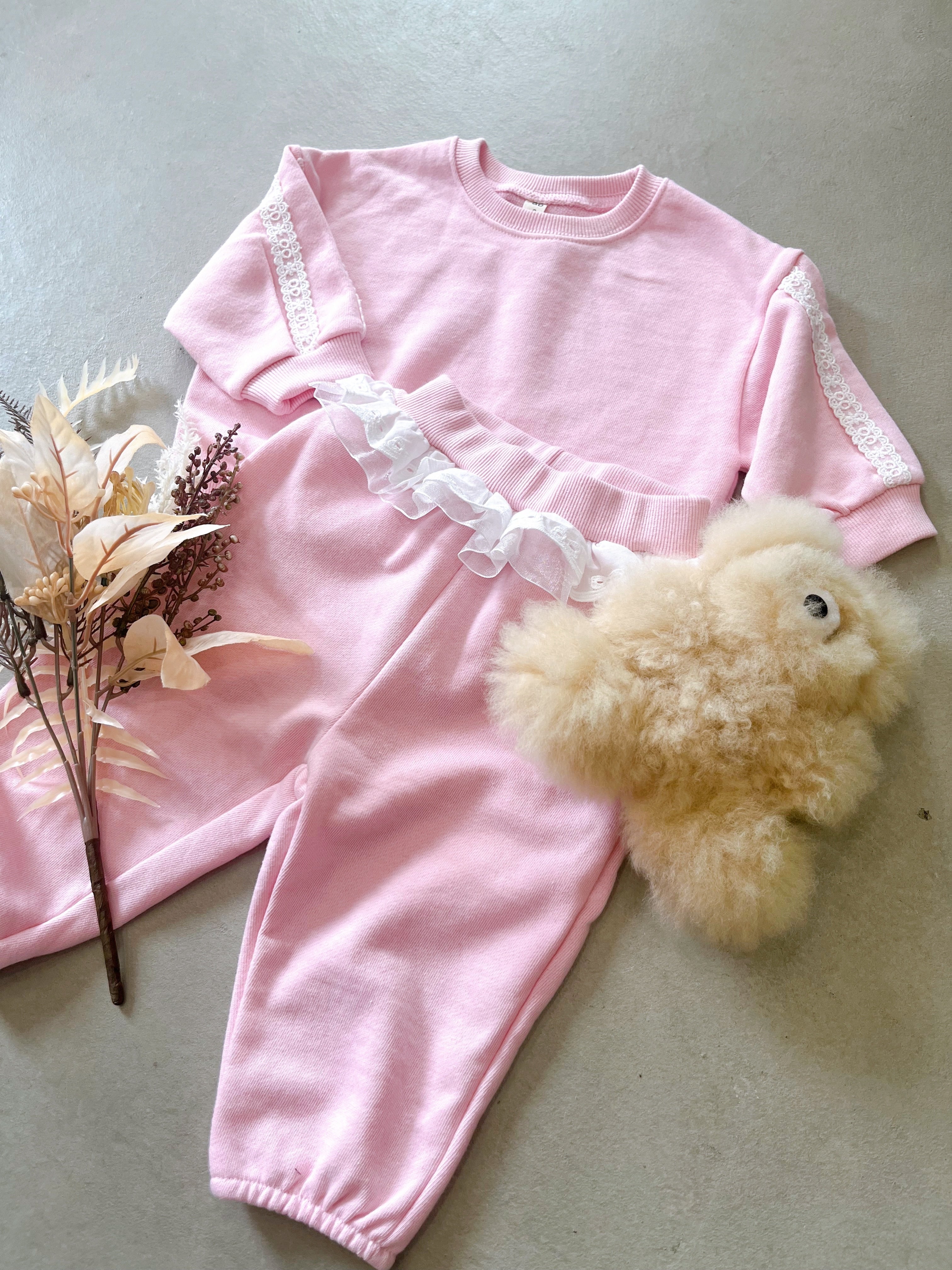 肩とウエストにレースやフリルをあしらった、女の子らしさ満点のスウェットセットアップ。
